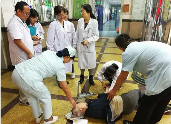 2017年9月29日16:30,交通医院门诊大厅内一位来院就诊患者突然意识丧失、摔倒在地。正好路过的医院控感办主任、医保办主任看到后,迅速上前呼救求救,就近的内二科诊室应诊医师和护士听到呼救,迅速跑出诊室参与急救,过程中,发现患者枕部出血,立即呼叫神经外科主任、骨...