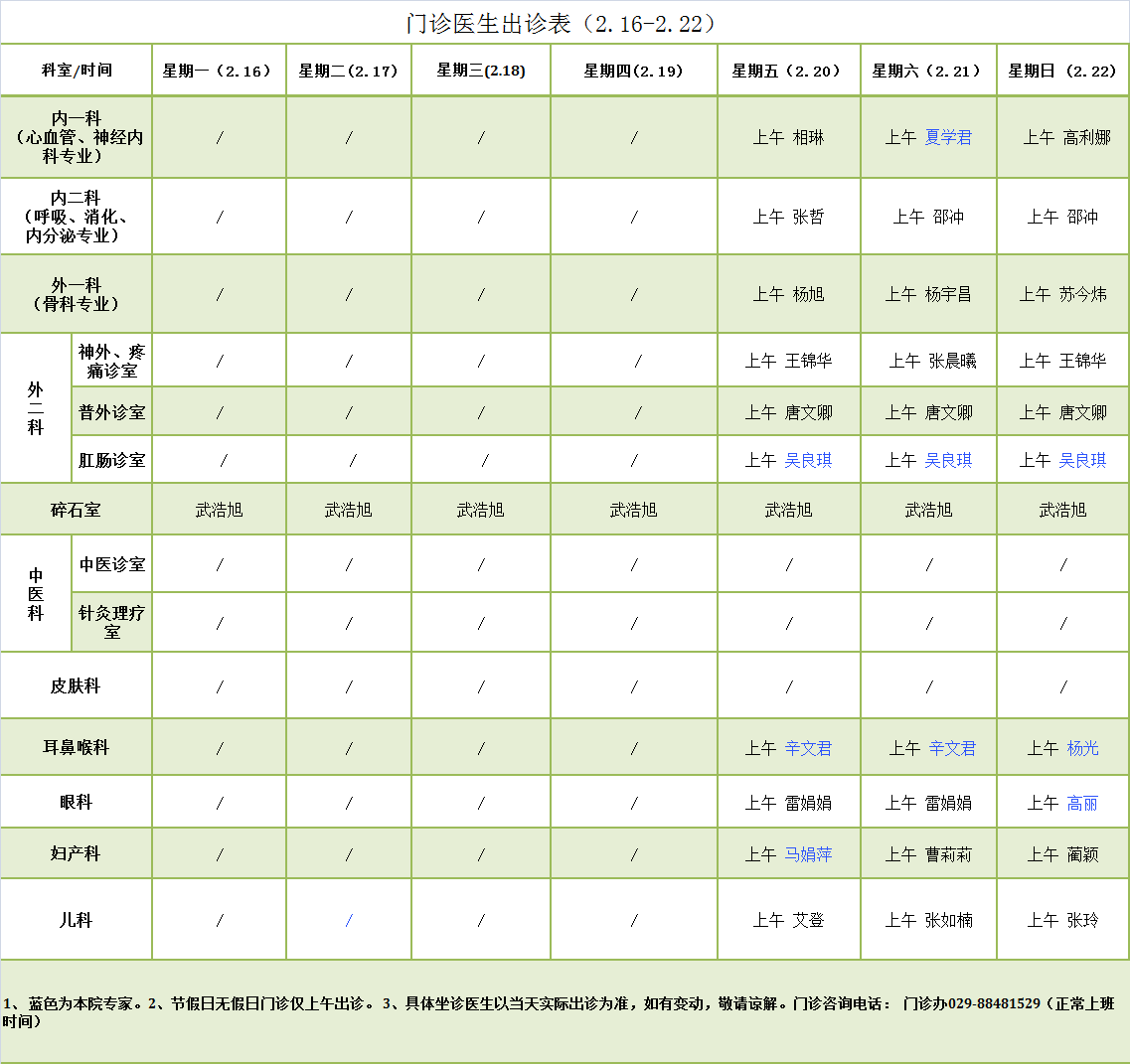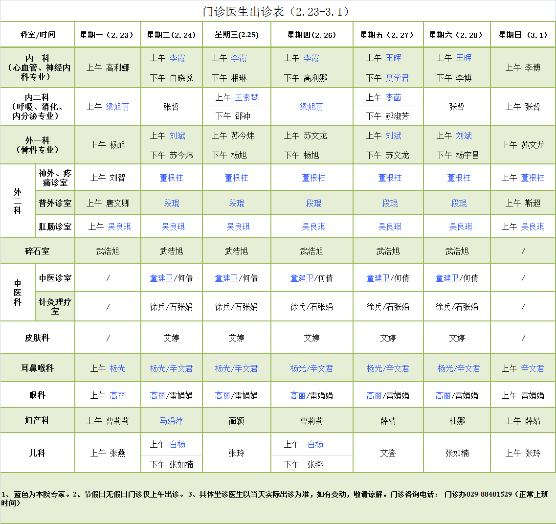 陕西省交通医院门诊医生出诊表